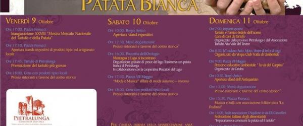 Due fine settimana all'insegna della qualità, dell'enogastronomia, della cultura, della natura, del folklore... insomma di tutto e di più a Pietralunga... iniziamo con venerdì 9 con l'apertura degli stands espositivi di prodotti tipici ed artigianato locale. Sabato 10, oltre che assaporare presso i ristoranti locali il piatto principe di questa manifestazione " Gnocchi di Patata Bianca con Tartufo" sarà possibile degustare gratuitamente il Pesce del lago Trasimeno abbinato alla Patata Bianca di Pietralunga grazie alla cooperativa Pescatori del Lago.